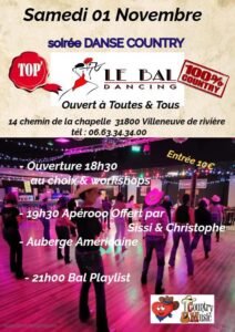 Le Samedi 1er Novembre 2025, Soirée Country à 21h00, *Le Bal Dancing*, 14 Chemin de la Chapelle, à Villeneuve de Rivière (31800), Haute Garonne.