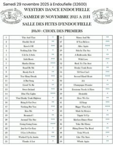Le Samedi 29 Novembre 2025, Soirée Country chez *Western Dance Endoufielle*, à 21h00, Salle des Fetes D’Endoufielle (32600), Gers.