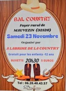 Le Samedi 23 Novembre 2024, Bal Country chez *A Labrihe de la Country*, à 20h30, Foyer Rural de Mauvezin (32120), Gers.