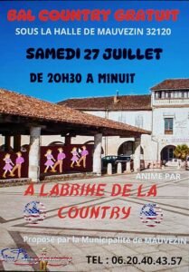 Le Samedi 27 Juillet 2024, Bal Country Gratuit, animé par *A Labrihe de la Country*, Proposé par la Municipalité , de 20h30 à Minuit, sous la Halle de Mauvezin (32120), Gers.