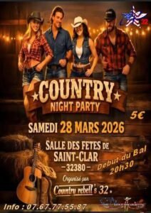 Le Samedi 28 Mars 2026, Country Night Party des *Country Rebel’s 32*, à 20h30, Salle ds Fêtes de Saint Clar (32380), Gers.