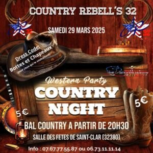Le Samedi 29 Mars 2025, Soirée Western Party – Country Night organisée par Country Rebell’s 32, à partir de 20h30 à la Salle des Fêtes de Saint-Clar (32380).