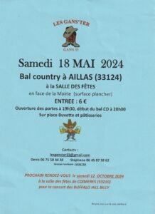 Le Samedi 18 Mai 2024, Bal Country cd à 20h00, Salle des Fetes, en Face de la Mairie, à Aillas (33124), Gironde.