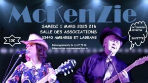 Le Samedi 1er Mars 2025, Soirée Country avec Concert de *McKenZie*, à 21h00, Salle des Associations, à Ambares et Lagrave (33440), Gironde.