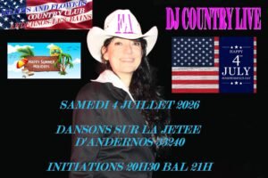 Le Samedi 04 Juillet 2026, Soirée *Independance Day*, avec *DJ Country Live*, à partir de 20h30 avec Initiations et Bal à 21h00, sur la Jetée, à Andernos les Bains (33240), Gironde.