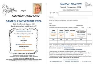 Le Samedi 02 Novembre 2024, Journée Country Line Dance des *West Country Boi*, à partir de 10h00, avec Workshops de *Heather Barton* (SCO) et Bal cd à 20h00,