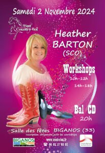Le Samedi 02 Novembre 2024, Journée Country Line Dance des *West Country Boi*, à partir de 10h00, avec Workshops de *Heather Barton* (SCO) et Bal cd à 20h00,