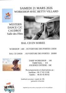 Le Samedi 21 Mars 2026, Journée Country à partir de 14h00, avec Workshop de *Betty Villard*, et Bal cd le Soir à 20h30, chez *Western Dance C2C Caudrot*,Salle des Fêtes de Caudrot (33490), Gir