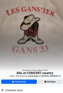 Le Samedi 10 Octobre 2026, Bal Country Concert avec *Les Gans’ter Gans 33*, à 20h00, à Coimeres (33210), Gironde.