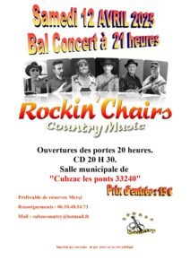 Le Samedi 12 Avril 2025, Bal Country avec Concert des *Rockin’Chairs Country Music*, à 21h00, Salle Municipale de Cubzac les Pon