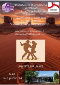Le Dimanche 1er Février 2026, Après Midi Bal Country Line Dance des *Ale Country*, de14h00 à 19h00, au Vigean, 2 rue Serge Mallet,