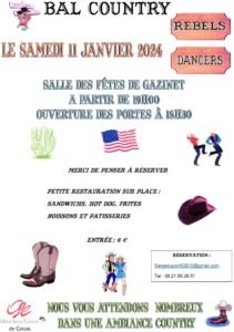 Le Samedi 11 Janvier 2025, Bal Country des *Rebels Dancers*, à 19h00, Salle des Fetes de Gazinet (33) Gironde.