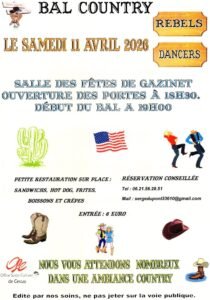 Le Samedi 11 Avril 2026, Bal Country des *Rebels Dancers*, à 19h00, Salle des Fêtes de Gazinet (33610), Gironde.