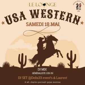 Le Samedi 18 Mai 2024, Soirée USA Western, avec Démonstration de Danse en Ligne, dans une Ambiance Country, de 22h00 à 02h00, au Lounge, avec *DJ Set a Delta33 event’s & Laurent*, 09, All harles Perrault, à Gujan Mestras (33), Gironde.
