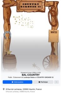 Le Dimanche 08 Mars 2026, Après Midi Bal Countryde *Lesdespe Rados et Country Gironde*, à 14h00, 8 rue de Lachanau, à Hourtin (33990) , Gironde.