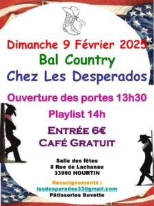 Le Dimanche 09 Février 2025, Après Midi Bal Country chez *Les Desperados*, à 14h00, Salle des Fetes, 08, rue de Lachanau, à Hourtin (33990), Gironde.