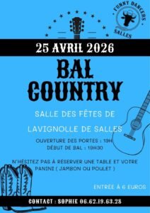Le Samedi 25 Avril 2026, Bal Country chez *Funny Dancers Salles*, à 19h30, Salle des Fêtes de Lavignolle de Salles (33) Gironde.