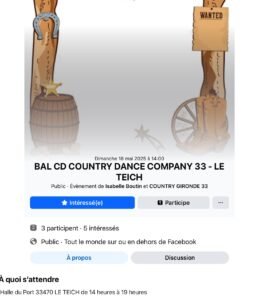 Le Dimanche 18 Mai 2025, Après Midi Bal Country cd chez *Country Gironde 33* avec *Isabelle Boutin*, de 14h00 à 19h00, Halle du Port à Le Teich (33470), Gironde.