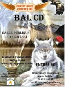 Le Dimanche 23 Novembre 2025, Après Midi Bal Country cd des *Country Dance Company 33*, de 14h00 à 19h00, Salle Publique, à Le Teich (33), Gironde.