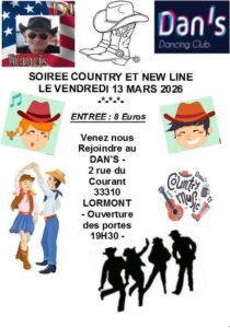 Le Vendredi 13 Mars 2026, Soirée Country et New Line animée par *DJ Francis*, à 19h30, au *Dan’s *, 2 rue du Courant, à Lormont (33310), Gironde.