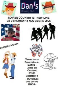Le Vendredi 14 Novembre 2025, Soirée Country et New Line à 19h30, au Dan’s, 2 rue du Courant, à Lormont (33310), Gironde.