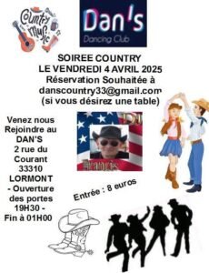 Le Vendredi 04 Avril 2025, Soirée Country de 19h30 à 01h00, au *Dan’s*, 2 rue du Courant à Lormont (33310), Gironde.