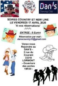 Le Vendredi 17 Avril 2026, Soirée Country des *Danse Country 33* , à 19h30, au *Dan’s Dancing Club*,02 rue du Courant, à Lormont (33310), Gironde.
