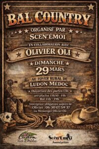 Le Dimanche 29 Mars 2026, Après Midi Bal Country chez *Scen’Emoi* et *Olivier Oli*, de 14h00 à 19h00, au Foyer Rural de Ludon Médoc (33), Gironde.
