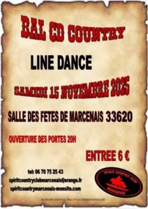 Le Samedi 15 Novembre 2025, Bal Country Line Dance cd chez *Spirit Country Club *, à 20h00, Salle des Fêtes de Marcenais (33620), Gironde.