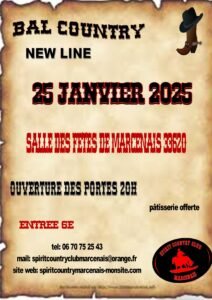 Le Samedi 25 Janvier 2025, Bal Country New Line des *Spirit Country Club *, à 20h00, Salle des Fetes de Marcenais (33620), Gironde.