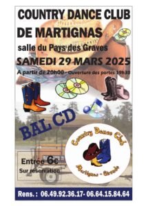 Le Samedi 29 Mars 2025, Bal Country cd chez *Country Dance Club Martignas*, à 20h00, Salle du Pays des Graves, 2 rue Jules Ferry à Martignas (33127), Gironde.