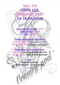 Le Samedi 18 Janvier 2025, Bal Country cd chez les *Country Pod*, à 19h00, Salle du Sporting, Allées Montel, à Pondensac (33720), Gironde.