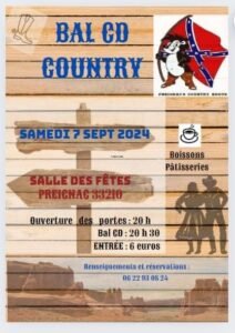 Le Samedi 07 Septembre 2024, Bal Country cd à 20h30, Salle des Fetes de Preignac (33210), Gironde.