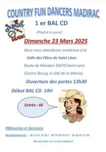 Le Dimanche 23 Mars 2025, 1er Après Midi Bal Country cd des *Country Fun Dancers Madirac*, à 14h00, Salle des Fetes, Route de Mondon, à Saint Léon (33670), Gironde.