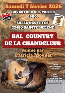 Le Samedi 07 Février 2026, Bal Country de la Chandeleur, animé par *Patricia Moynet*, à 19h00, Salle des Fêtes de Sainte Helene (33480), Gironde.