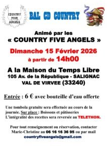 animé par *Country Five Angels*, à 14h00, Maison du Temps Libre, 105 Avenue de la République,Salignac Val de Virvee (33240), Gironde.