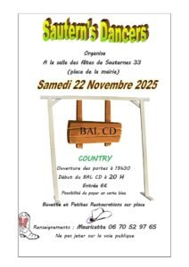 Le Samedi 22 Novembre 2025, Bal Country cd chez *Sautern’s Dancers*, à 20h00, Salle des Fetes, Place de la Mairie de Sauternes (33), Gironde.
