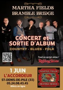 Le Samedi 1er Juin 2024, Soirée Concert Country Blues et Folk animé par *Martha Fields Bramble Bridge*, à L’Accordeur, à St Denis de Pile (33), Gironde.