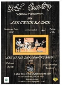 Le Samedi 12 Octobre 2024, Journée Country chez *Les Crocs Blancs*, à partir de 14h30, avec Workshops Gratuits et Soirée Concert des *Apple Jack Country Band*, à 21h00,