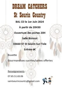 Le Samedi 1er Juin 2024, Bal Country cd chez *Dream Catchers*, à 20h30, Salle Bonnot, à St Seurin sur L’isle (33660), Gironde.