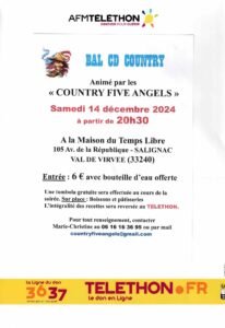 Le Samedi 14 Décembre 2024, Bal Country cd animé par *Country Five Angels*, au profit du Téléthon, à 20h30, Maison du Temps Libre, 105, Avenue de la République, Salignac, Valde Virvée (33240), Gironde.