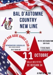 Le Samedi 11 Octobre 2025, Bal D’Automne Country Line chez *Agde Dance Club*, Thème Amerique, à 19h00, Salle des Fetes de Bessan (34), Hérault.