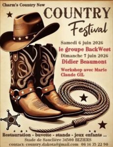 Les Samedi 06 et Dimanche 07 Juin 2026, Week End Country Festival animé par des Concerts de *Backwest* et *Didier Beaumont*, Workshop de *Marie Claude Gil*, au Stad