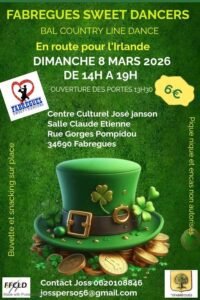 Le Dimanche 08 Mars 2026, Après Midi Bal Country Line Dance Irlandais des *Fabregues Sweet Dancers*, de 14h00 à 19h00, Centre Culturel José Janson, Salle Claude Etienne, rue Georges Pompidou, à Fabregue
