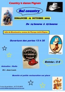 Le Dimanche 19 Octobre 2025, Après Midi Bal Country chez *Country K Danse Pignan*, de 14h00 à 19h00, Salle du Bicentenaire, Avenue de L’Europe, à Pignan (34570), Hérault.