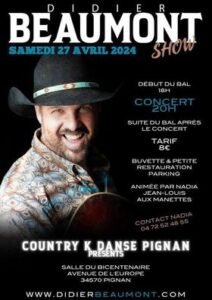 Le Samedi 27 Avril 2024, Bal Country à partir de 18h00, avecConcert de *Didier Beaumont à 20h00, Salle du Bicentenaire, Avenue de L’Europe, à Pignan (34570), Hérault.