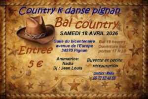 Le Samedi 18 Avril 2026, Bal Country chez *Country K Danse Pignan*, animé par *Nadia et DJ Jean Louis*, à 18h00, Salle du Bicentenaire, Avenue de L’Europe, à Pignan (34570), Hérault.