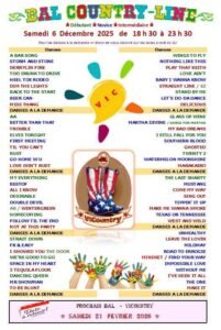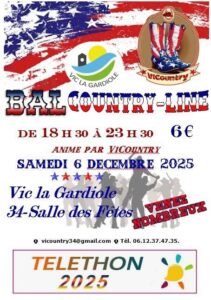 Le Samedi 06 Décembre 2025, Bal Country Line animé par *ViCountry*, de 18h30 à 23h30, Salle des Fêtes de Vic la Gardiole (34110) , Hérault.