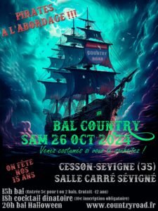Le Samedi 26 Octobre 2024, Bal Country Halloween chez *Coutry Road*, à 20h00, Salle Carré Sévigné, à Cesson Sevigne (35), Ille et Vilaine.