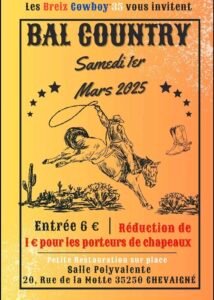 Le Samedi 1er Mars 2025, Bal Country des *Breiz Cowboy 35*, Salle Polyvalente, 20, rue de la Motte, à Chevaigné (35250), Ille et Vilaine.